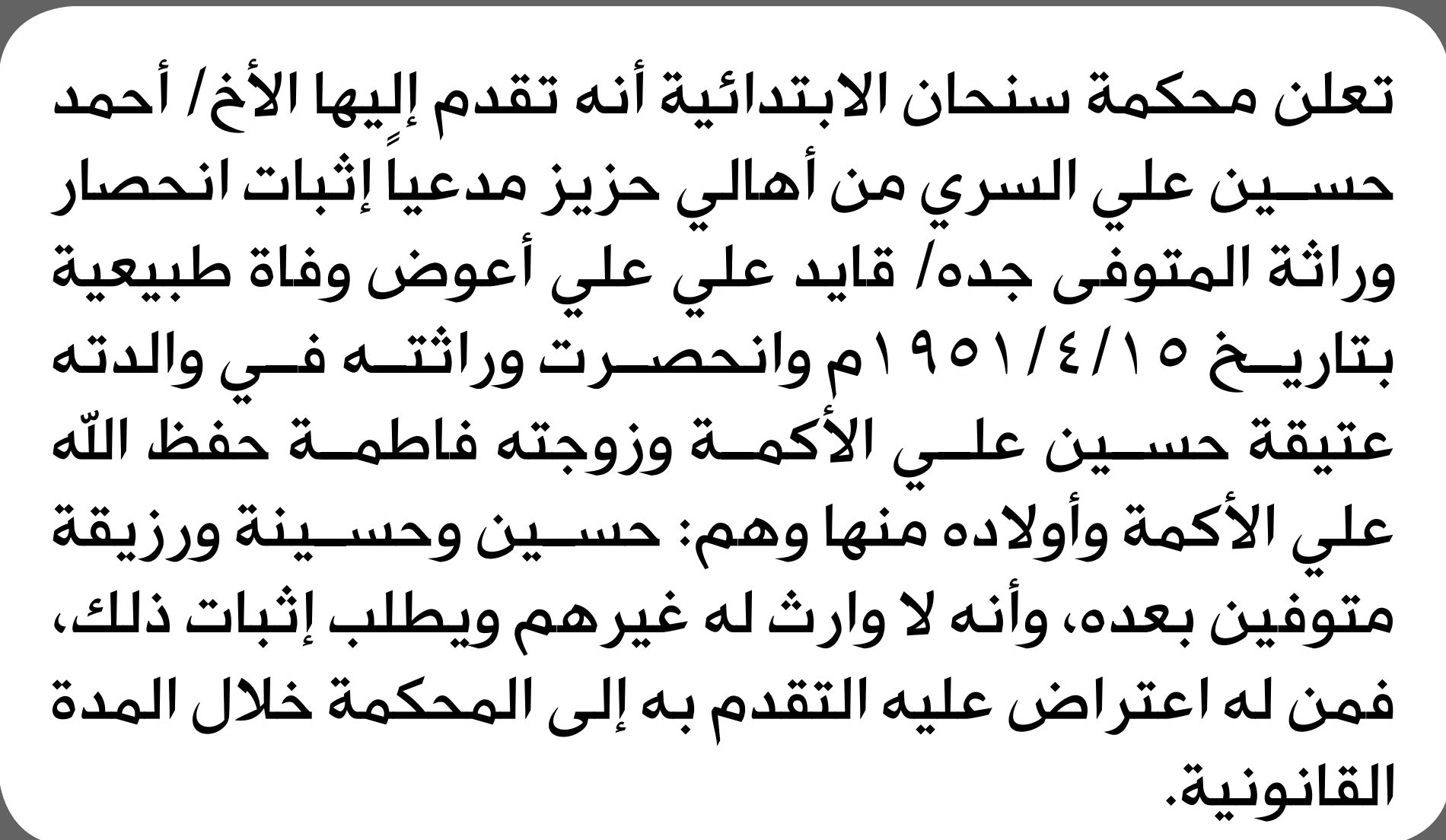 تعلن محكمة سنحان أن الأخ أحمد حسين السري تقدم بدعوى انحصار وراثة إعلاناتمحاكم On مارس 18, 2026 Share Share FacebookTwitterWhatsAppTelegramGoogle+البريد الإلكترونيPrint