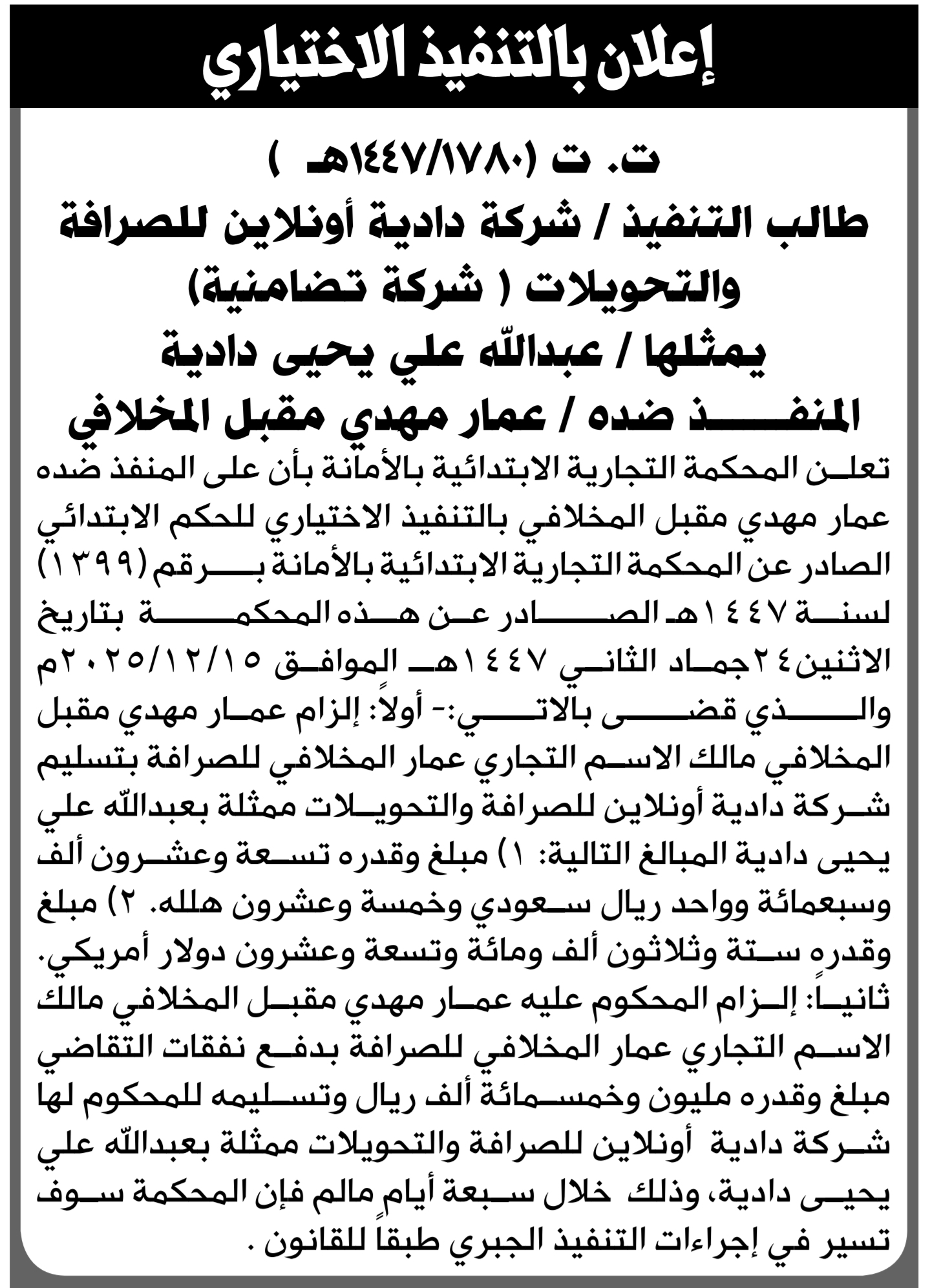 تعلن المحكمة التجارية بالأمانة أن على المنفذ ضده عمار المخلافي بالتنفيذ الاختياري للحكم إعلاناتمحاكم On مارس 29, 2026 Share Share FacebookTwitterWhatsAppTelegramGoogle+البريد الإلكترونيPrint