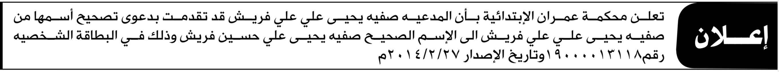 تعلن محكمة عمران أن المدعية صفية يحيى فريش تقدمت بطلب تصحيح اسمها إعلاناتمحاكم On مارس 29, 2026 Share Share FacebookTwitterWhatsAppTelegramGoogle+البريد الإلكترونيPrint