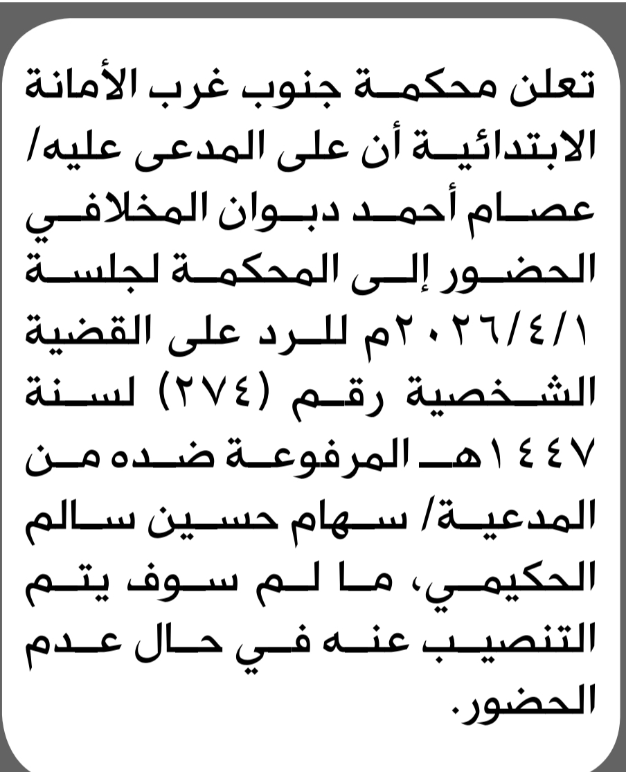 تعلن محكمة جنوب غرب الأمانة أن على المدعى عليه عصام المخلافي الحضور إلى المحكمة إعلاناتمحاكم On أبريل 1, 2026 Share Share FacebookTwitterWhatsAppTelegramGoogle+البريد الإلكترونيPrint