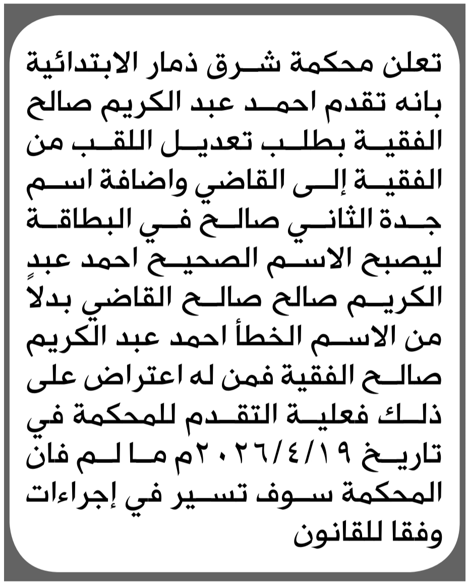 تعلن محكمة شرق ذمار أن الأخ أحمد الفقيه تقدم بدعوى تصحيح اسمه إعلاناتمحاكم On أبريل 1, 2026 Share Share FacebookTwitterWhatsAppTelegramGoogle+البريد الإلكترونيPrint