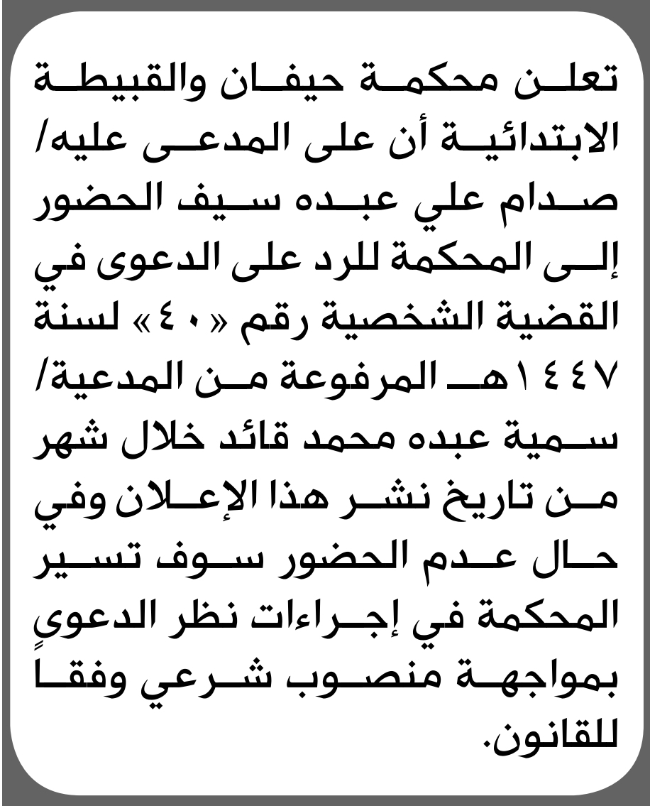 تعلن محكمة حيفان والقبيطة الابتدائية بأن على/ صدام علي سيف الحضور إلى المحكمة إعلاناتمحاكم On أبريل 1, 2026 Share Share FacebookTwitterWhatsAppTelegramGoogle+البريد الإلكترونيPrint