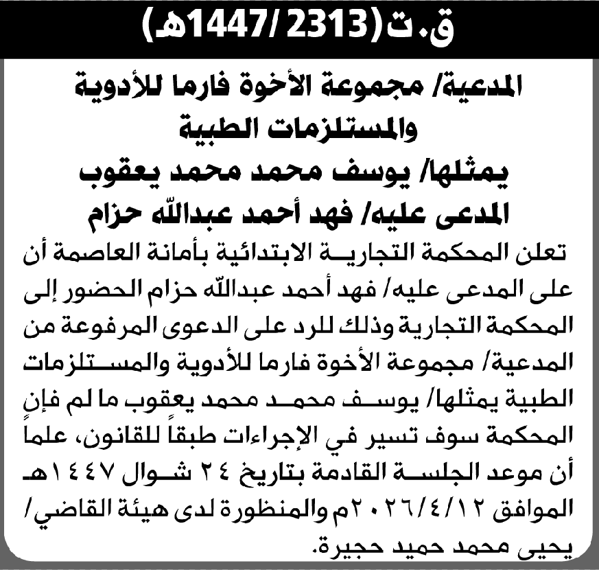 تعلن المحكمة التجارية بالأمانة أن على المدعى عليه فهد حزام الحضور إلى المحكمة إعلاناتمحاكم On أبريل 2, 2026 Share Share FacebookTwitterWhatsAppTelegramGoogle+البريد الإلكترونيPrint