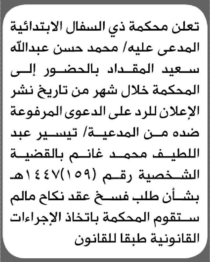 تعلن محكمة ذي السفال الابتدائية بأن على/ محمد حسن المقداد الحضور إلى المحكمة إعلاناتمحاكم On أبريل 3, 2026 Share Share FacebookTwitterWhatsAppTelegramGoogle+البريد الإلكترونيPrint
