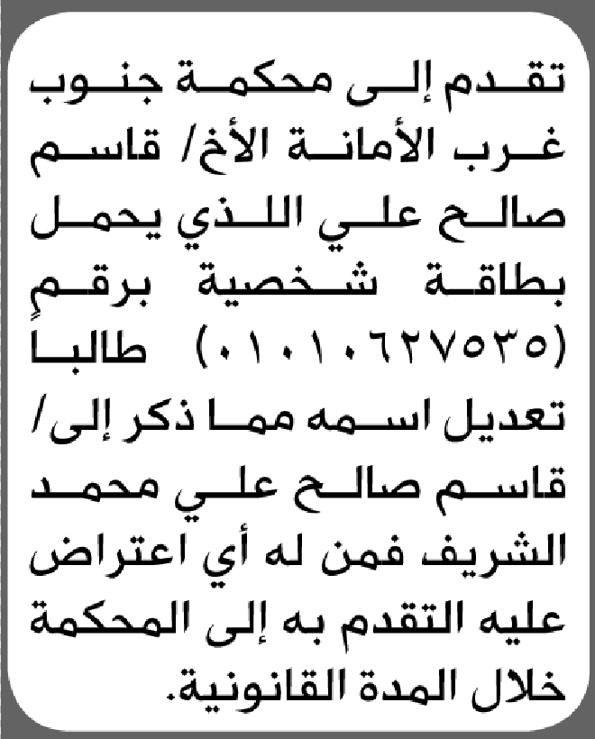 تعلن محكمة جنوب غرب الأمانة بأن الاخ/ قاسم صالح اللذي تقدم إليها بطلب تعديل اسمه إعلاناتمحاكم On أبريل 3, 2026 Share Share FacebookTwitterWhatsAppTelegramGoogle+البريد الإلكترونيPrint