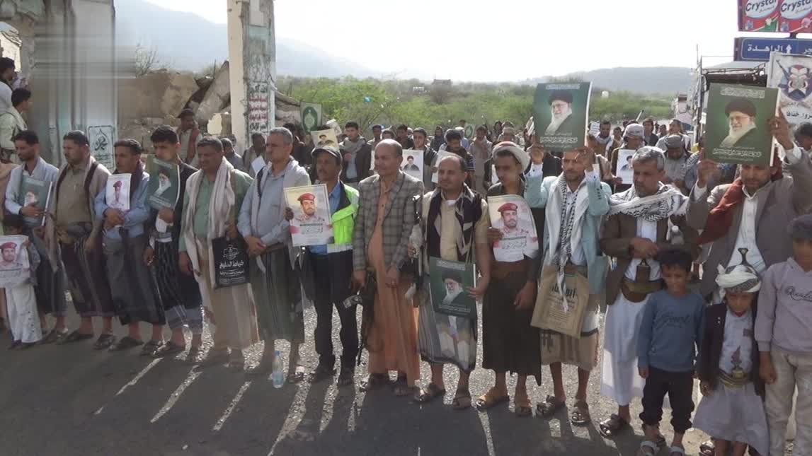 ورفع المشاركون في المسيرات بساحة الشهيد الصماد بالهجر، والأقصى بظمران والنصر بالكعبين، والوقفتين في مربع دياش، التي تقدمها وكيل المحافظة فيصل الفقيه، ومسؤول التعبئة العامة جميل الصوفي، ومدير المديرية وحيد الخضر، وقيادات محلية وعسكرية وأمنية، أعلام اليمن وفلسطين وإيران ولبنان والعراق، وصور الشهداء القادة.