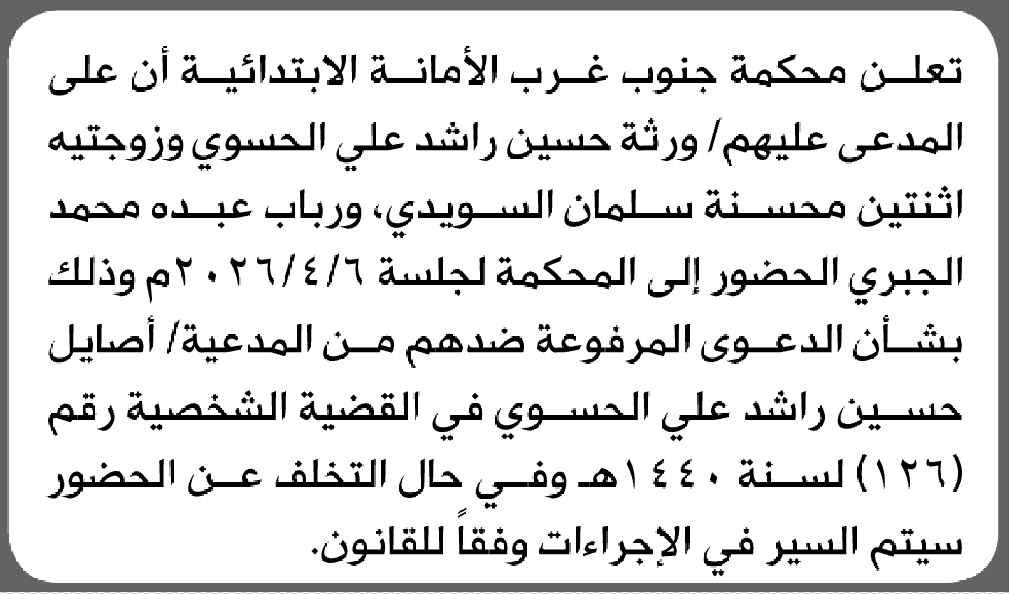 تعلن محكمة جنوب غرب الأمانة أن على المدعى عليهم ورثة حسين الحسوي الحضور إلى المحكمة إعلاناتمحاكم On أبريل 6, 2026 Share Share FacebookTwitterWhatsAppTelegramGoogle+البريد الإلكترونيPrint