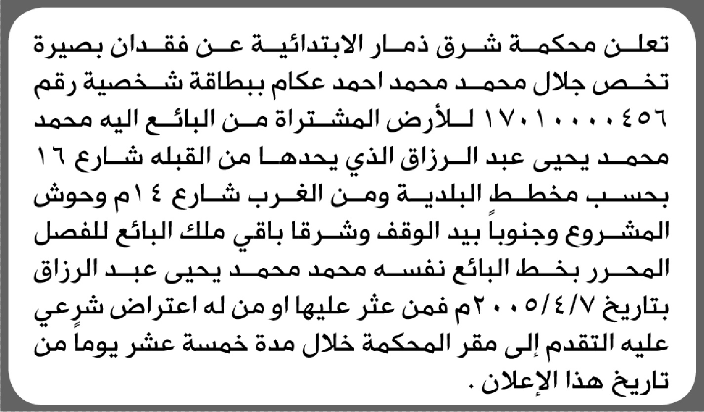 تعلن محكمة شرق ذمار عن فقدان بصيرة تخص جلال محمد عكام إعلاناتمحاكم On أبريل 6, 2026 Share Share FacebookTwitterWhatsAppTelegramGoogle+البريد الإلكترونيPrint