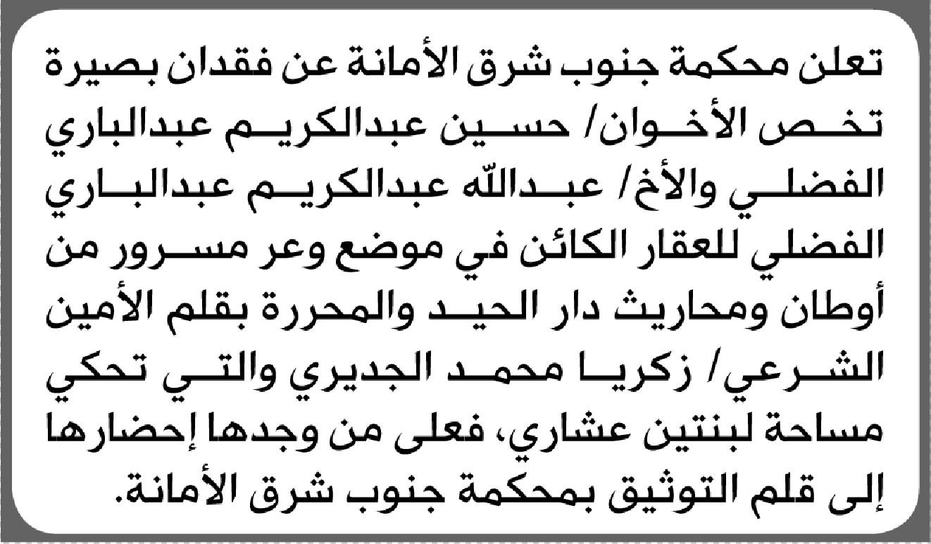 تعلن محكمة جنوب شرق الأمانة عن فقدان بصيرة تخص/ حسين عبدالكريم الفضلي إعلاناتفقدانات On أبريل 6, 2026 Share Share FacebookTwitterWhatsAppTelegramGoogle+البريد الإلكترونيPrint