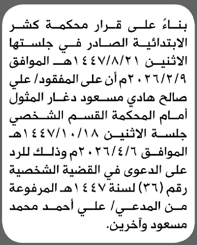تعلن محكمة كشر الابتدائية بأن على/ علي صالح دغار الحضور إلى المحكمة إعلاناتمحاكم On أبريل 6, 2026 Share Share FacebookTwitterWhatsAppTelegramGoogle+البريد الإلكترونيPrint