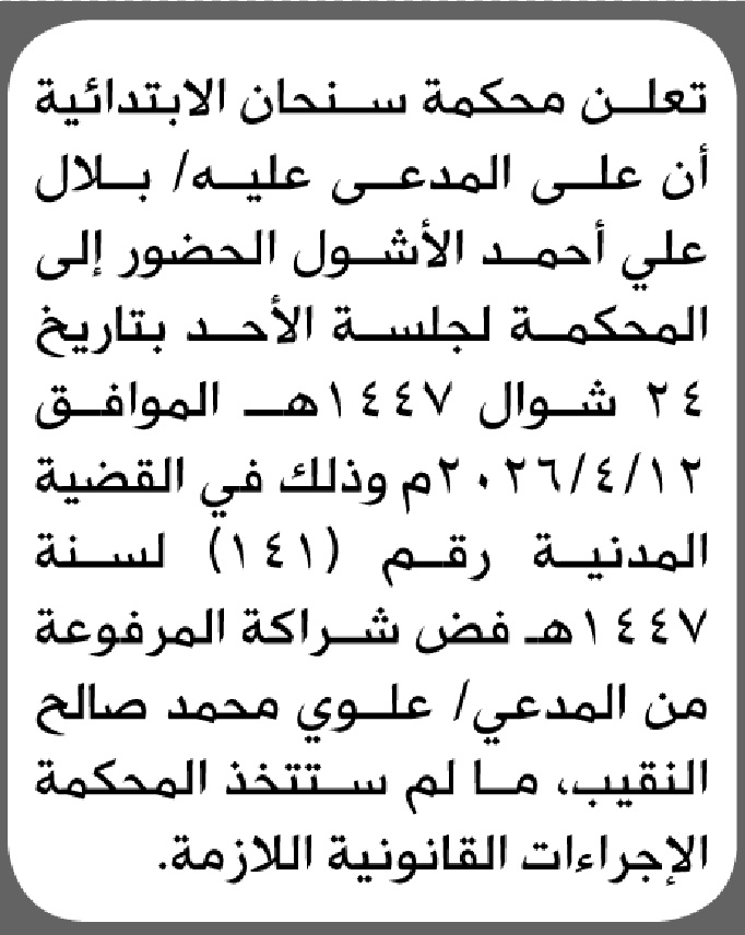 تعلن محكمة سنحان أن على المدعى عليه بلال الأشول الحضور إلى المحكمة إعلاناتمحاكم On أبريل 7, 2026 Share Share FacebookTwitterWhatsAppTelegramGoogle+البريد الإلكترونيPrint