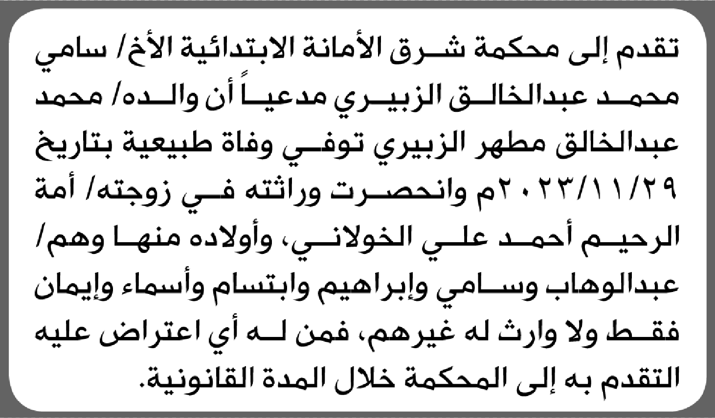 تعلن محكمة شرق الأمانة أن الأخ سامي الزبيري تقدم بدعوى انحصار وراثة إعلاناتمحاكم On أبريل 7, 2026 Share Share FacebookTwitterWhatsAppTelegramGoogle+البريد الإلكترونيPrint