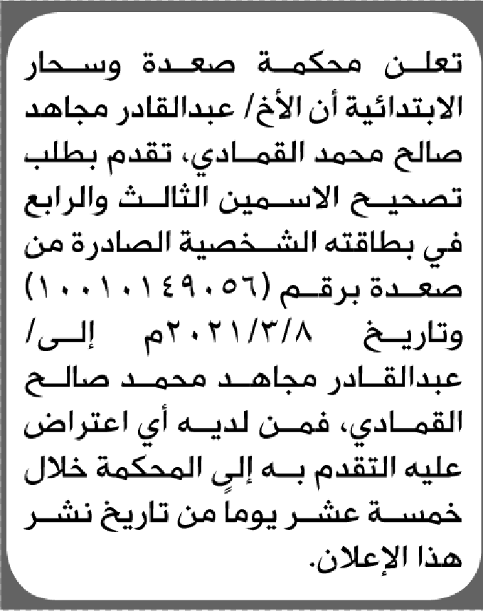 تعلن محكمة صعدة أن الأخ عبدالقادر القمادي تقدم بطلب تصحيح اسمه إعلاناتمحاكم On أبريل 7, 2026 Share Share FacebookTwitterWhatsAppTelegramGoogle+البريد الإلكترونيPrint