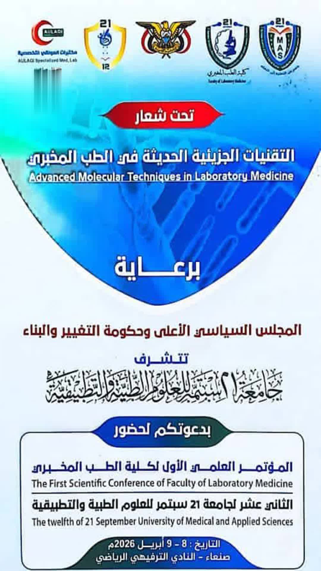 تنطلق يوم غدٍ الأربعاء بصنعاء، أعمال المؤتمر العلمي الأول لكلية الطب المخبري الثاني عشر لجامعة 21 سبتمبر للعلوم الطبية والتطبيقية تحت شعار “التقنيات الجزيئية الحديثة في الطب المخبري”.