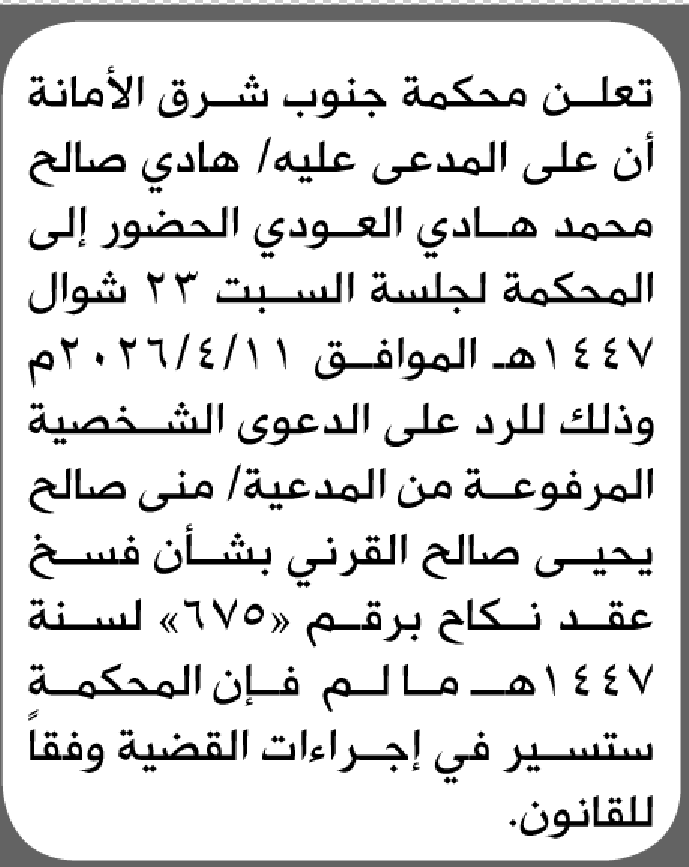 تعلن محكمة جنوب شرق الامانة بأن على/ هادي صالح العودي الحضور إلى المحكمة إعلاناتمحاكم On أبريل 8, 2026 Share Share FacebookTwitterWhatsAppTelegramGoogle+البريد الإلكترونيPrint