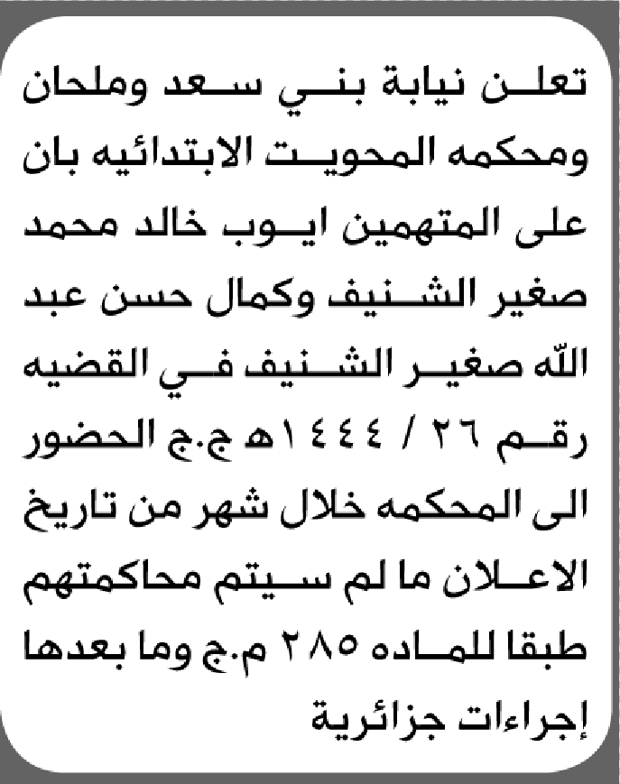تعلن محكمة المحويت الابتدائية بأن على/ أيوب وكمال الشنيف الحضور إلى المحكمة إعلاناتمحاكم On أبريل 8, 2026 Share Share FacebookTwitterWhatsAppTelegramGoogle+البريد الإلكترونيPrint