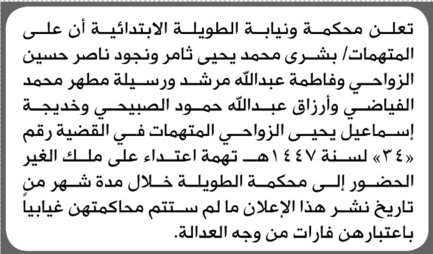 تعلن محكمة ونيابة الطويلة الابتدائية بأن على/ بشرى محمد ثامر واخريات الحضور إلى المحكمة إعلاناتمحاكم On أبريل 8, 2026 Share Share FacebookTwitterWhatsAppTelegramGoogle+البريد الإلكترونيPrint