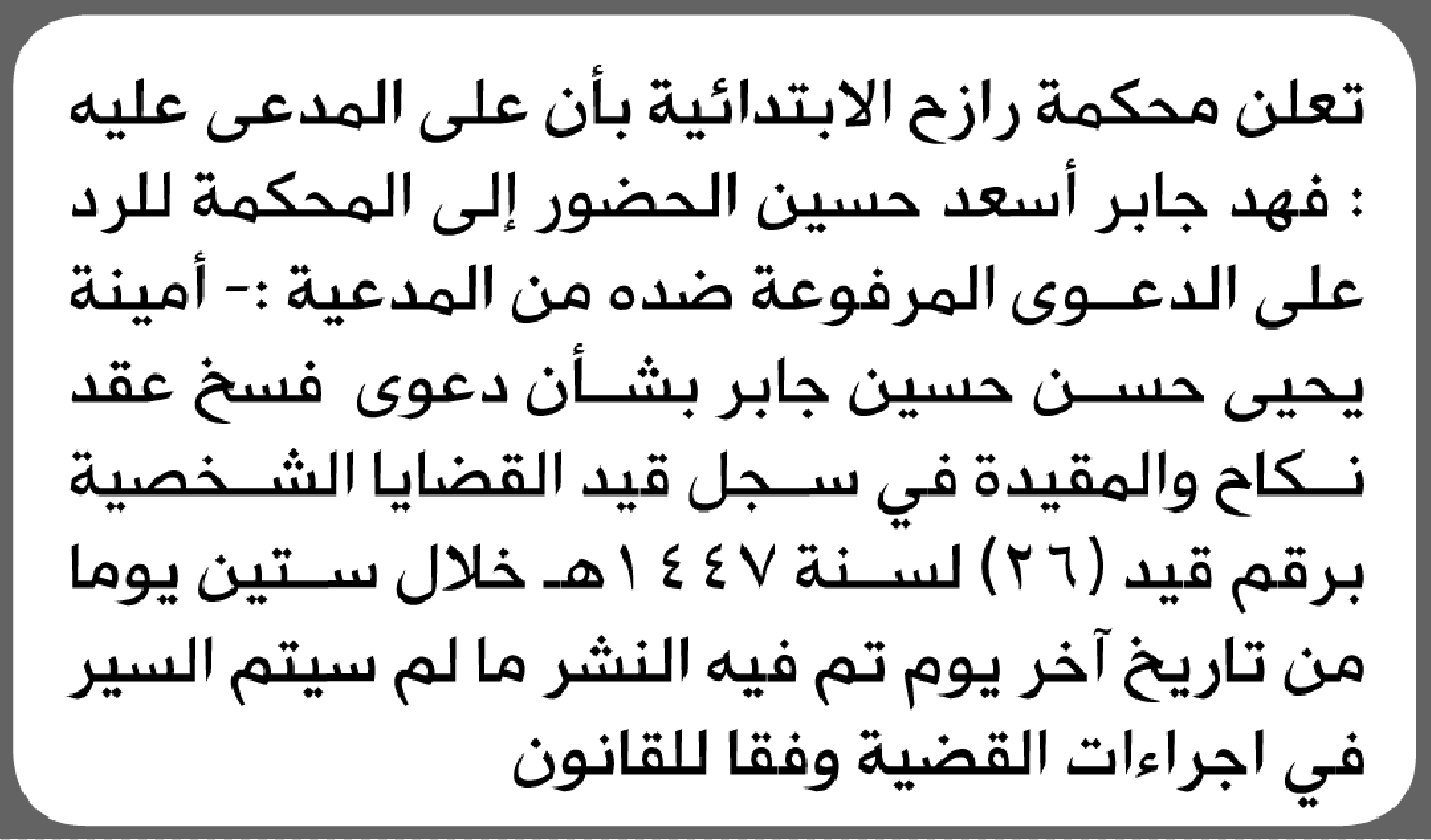تعلن محكمة رازح أن على المدعى عليه فهد جابر الحضور إلى المحكمة إعلاناتمحاكم On أبريل 8, 2026 Share Share FacebookTwitterWhatsAppTelegramGoogle+البريد الإلكترونيPrint