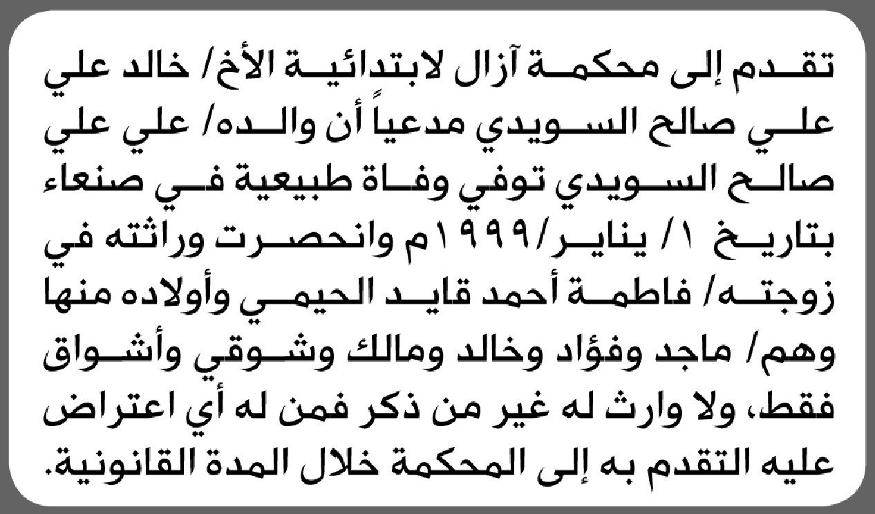 تعلن محكمة آزال أن الأخ خالد السويدي تقدم بدعوى انحصار وراثة إعلاناتمحاكم On أبريل 9, 2026 Share Share FacebookTwitterWhatsAppTelegramGoogle+البريد الإلكترونيPrint