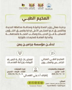 تدّشن مؤسسة جرامين يمن، الأحد المقبل، المخيم الطبي المجاني الـ25 لجراحة العيون بمديرية الزهرة في محافظة الحديدة.