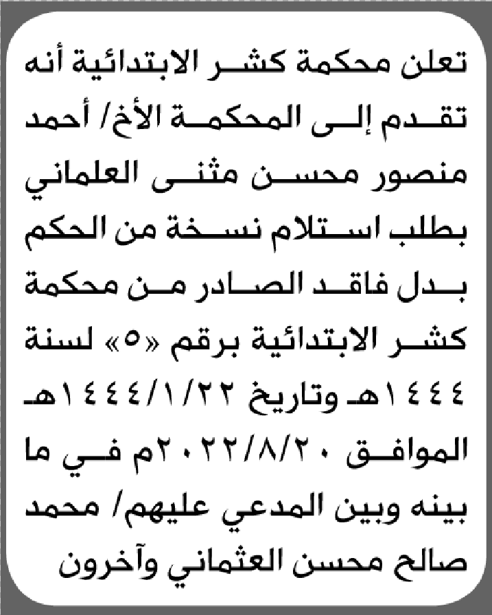 تعلن محكمة كشر الابتدائية بأن الأخ/ أحمد منصور العلماني تقدم إليها بطلب استلام حكم بدل فاقد إعلاناتفقدانات On أبريل 10, 2026 Share Share FacebookTwitterWhatsAppTelegramGoogle+البريد الإلكترونيPrint