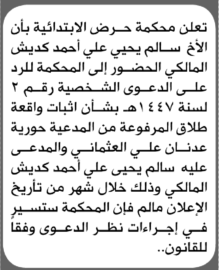 تعلن محكمة حرض الابتدائية بأن على/ سالم يحيى المالكي الحضور إلى المحكمة إعلاناتمحاكم On أبريل 10, 2026 Share Share FacebookTwitterWhatsAppTelegramGoogle+البريد الإلكترونيPrint