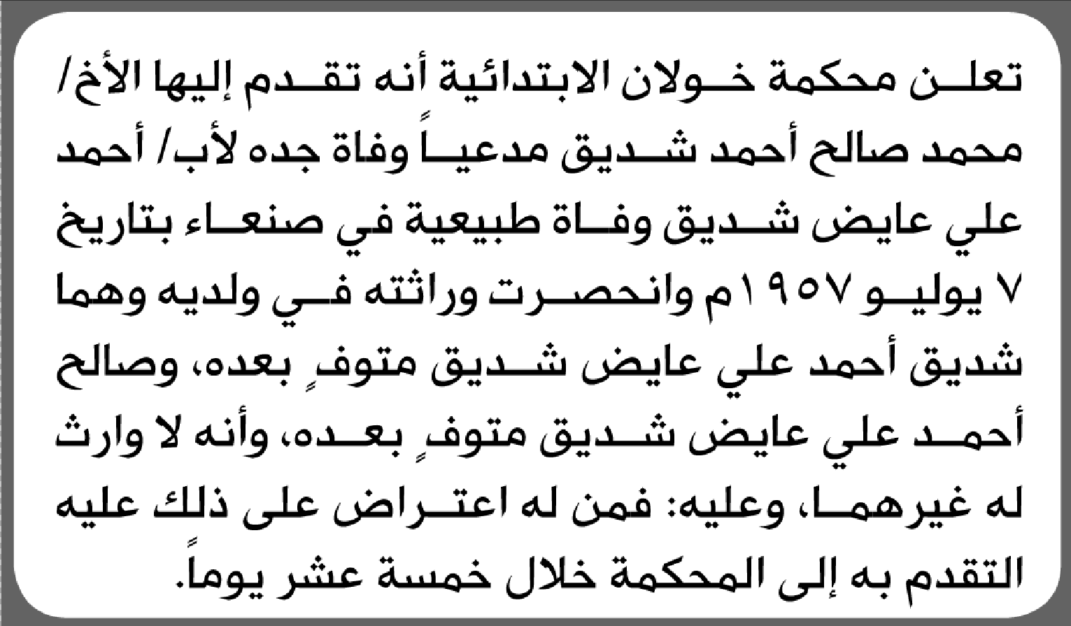 تعلن محكمة خولان الابتدائية بأن الأخ/ محمد صالح شديق تقدم إليها بطلب انحصار وراثة إعلاناتمحاكم On أبريل 10, 2026 Share Share FacebookTwitterWhatsAppTelegramGoogle+البريد الإلكترونيPrint