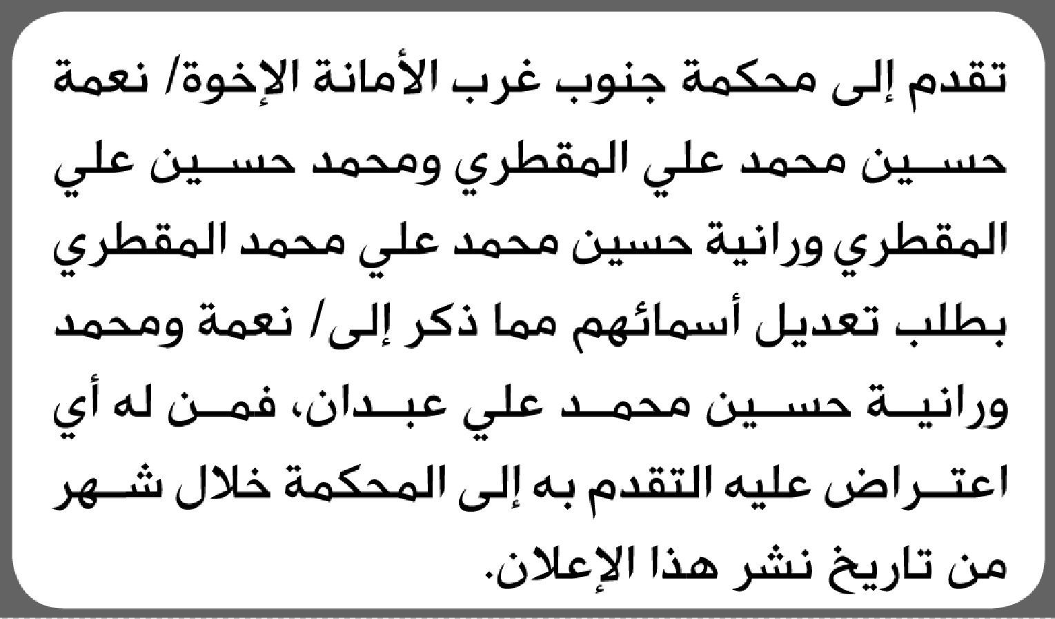 تعلن محكمة جنوب غرب الأمانة بأن الأخت/ نعمة ورانية المقطري تقدما إليها بطلب تعديل اسمائهن إعلاناتمحاكم On أبريل 10, 2026 Share Share FacebookTwitterWhatsAppTelegramGoogle+البريد الإلكترونيPrint