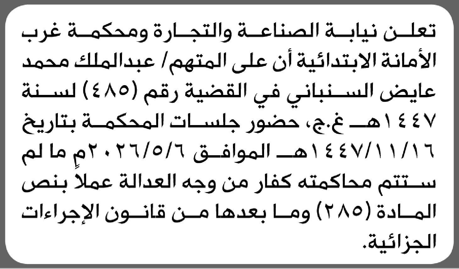 تعلن محكمة غرب الأمانه أن على المتهم عبدالملك السنباني الحضور الى المحكمة إعلاناتمحاكم On أبريل 10, 2026 Share Share FacebookTwitterWhatsAppTelegramGoogle+البريد الإلكترونيPrint