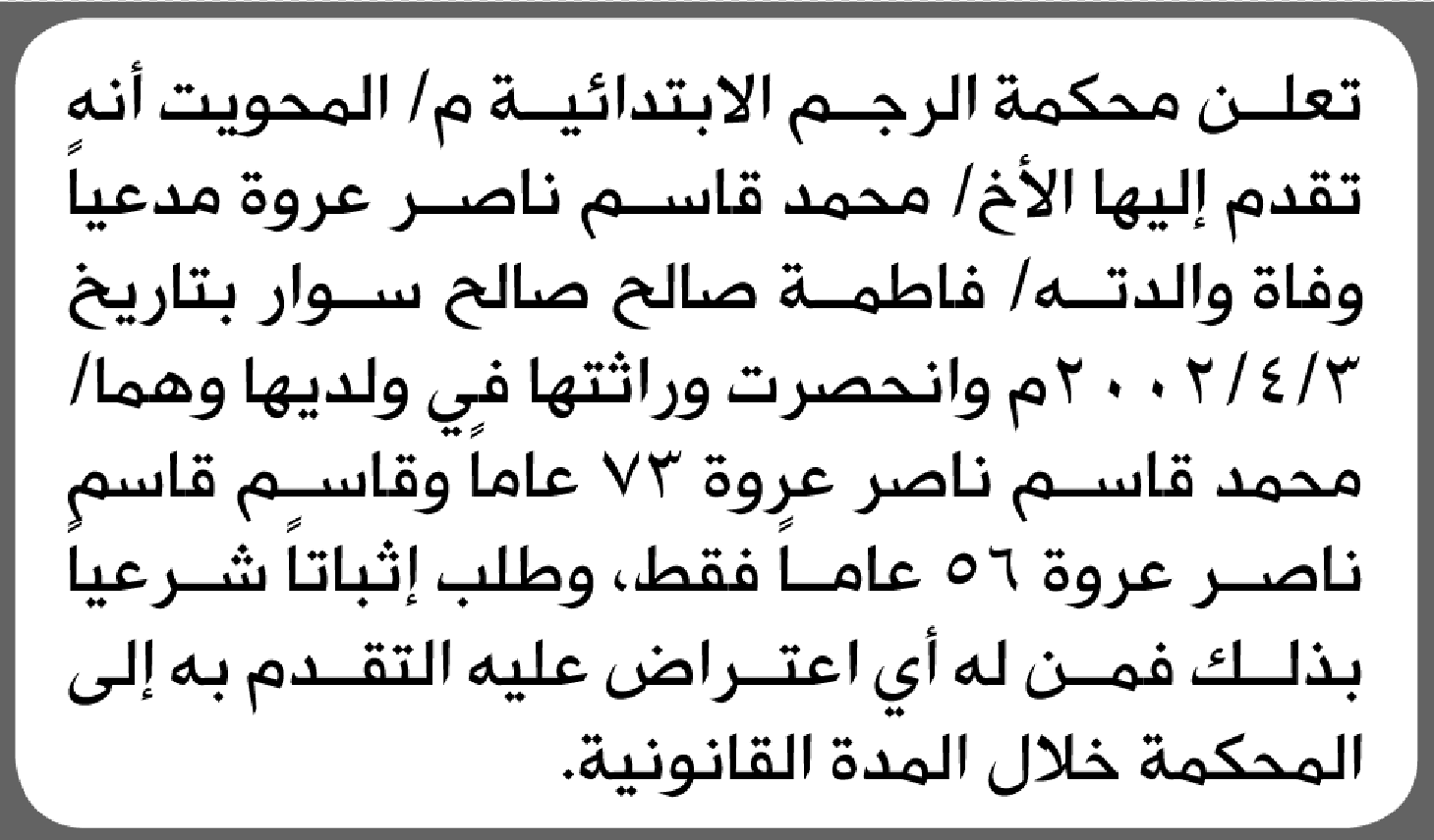 تعلن محكمة الرجم م/المحويت أنه تقدم اليها محمد ناصر بطلب إنحصار وراثة إعلاناتمحاكم On أبريل 10, 2026 Share Share FacebookTwitterWhatsAppTelegramGoogle+البريد الإلكترونيPrint