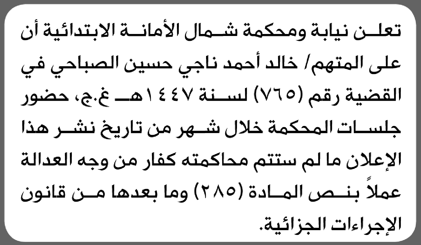 تعلن محكمة شمال الأمانة أن على المتهم خالد الصباحي إعلاناتمحاكم On أبريل 10, 2026 Share Share FacebookTwitterWhatsAppTelegramGoogle+البريد الإلكترونيPrint