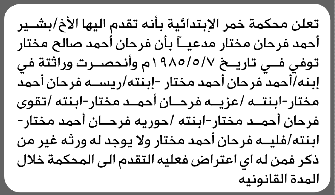 تعلن محكمة خمر الابتدائية بأن الأخ/ بشير أحمد مختار تقدم إليها بطلب انحصار وراثة إعلاناتمحاكم On أبريل 11, 2026 Share Share FacebookTwitterWhatsAppTelegramGoogle+البريد الإلكترونيPrint