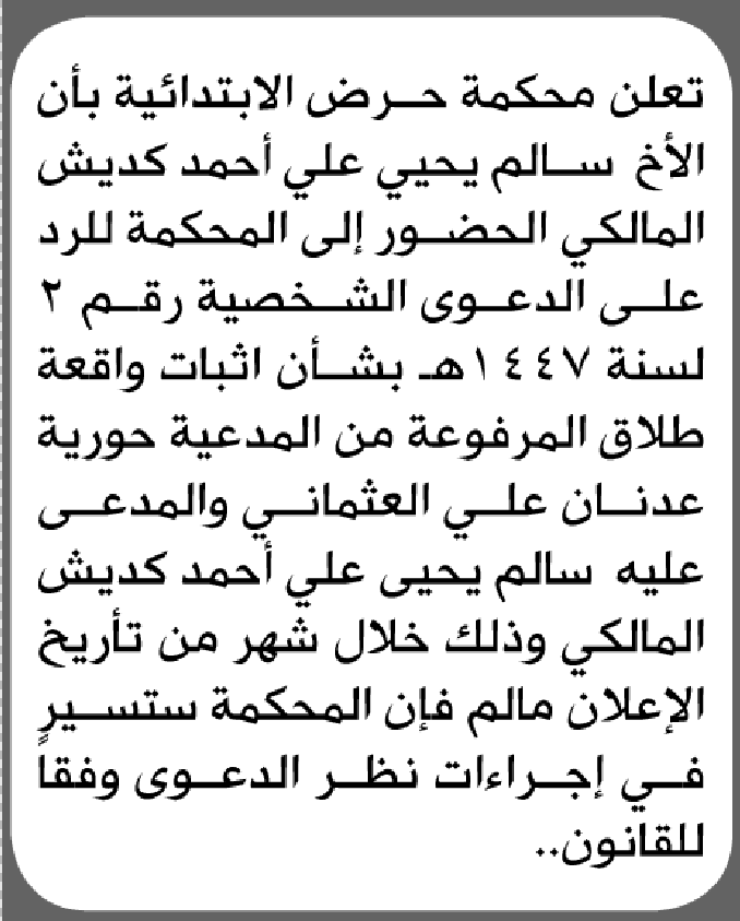 تعلن محكمة حرض الابتدائية بأن على/ سالم يحيى المالكي الحضور إلى المحكمة إعلاناتمحاكم On أبريل 11, 2026 Share Share FacebookTwitterWhatsAppTelegramGoogle+البريد الإلكترونيPrint