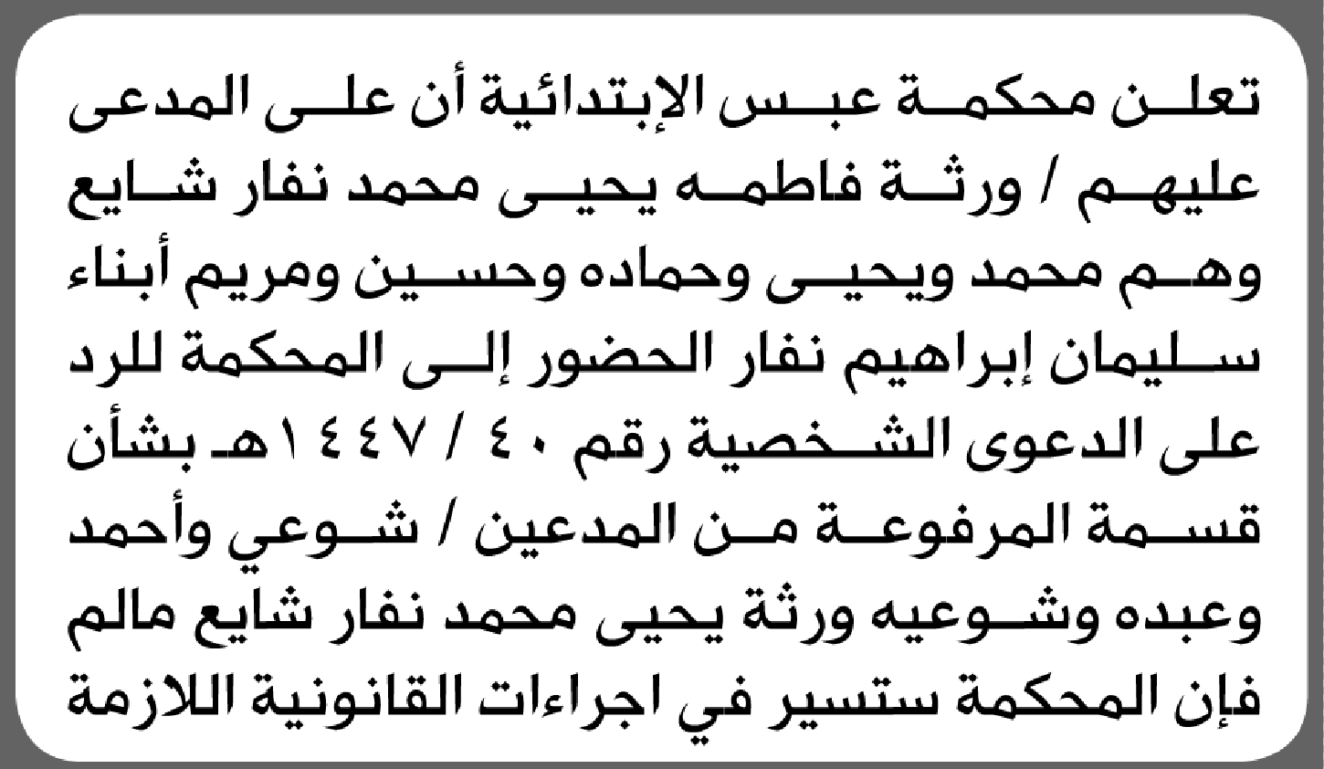 تعلن محكمة عبس الابتدائية بأن على ورثة/ فاطمة يحيى شايع الحضور إلى المحكمة إعلاناتمحاكم On أبريل 11, 2026 Share Share FacebookTwitterWhatsAppTelegramGoogle+البريد الإلكترونيPrint
