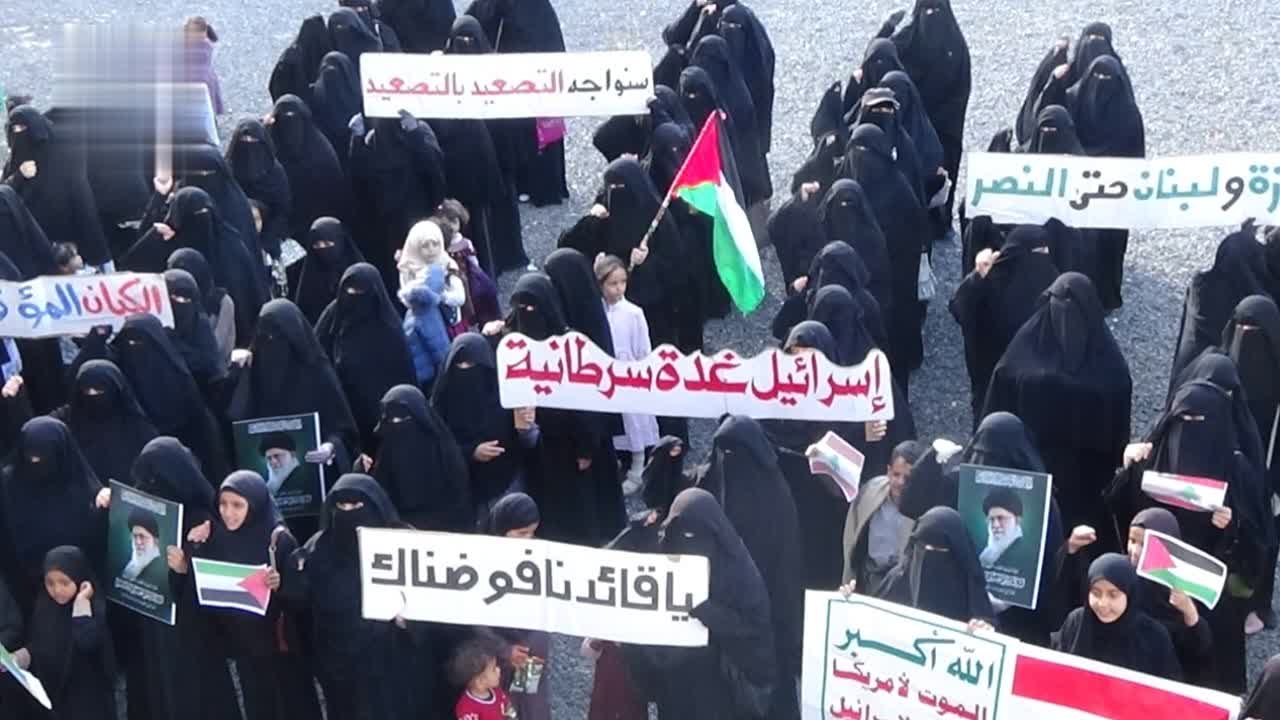 ورفعت المشاركات أعلام اليمن وفلسطين ولبنان وإيران، وهتافات عبّرت عن الاعتزاز بالانتصارات التي تحققت والتأكيد على المضي في درب المقاومة ورفض كل أشكال الهيمنة والوصاية الأجنبية على شعوب المنطقة.