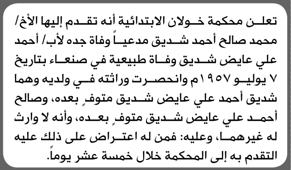 تعلن محكمة خولان الابتدائية بأن الأخ/ محمد صالح شديق تقدم إليها بطلب انحصار وراثة إعلاناتمحاكم On أبريل 12, 2026 Share Share FacebookTwitterWhatsAppTelegramGoogle+البريد الإلكترونيPrint