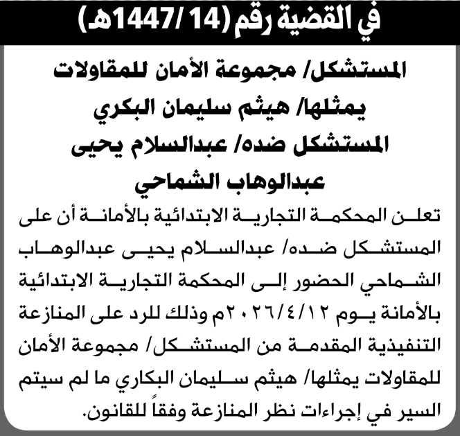 تعلن المحكمة التجارية بالأمانة أن على المستشكل ضده عبدالسلام الشماحي الحضور إلى المحكمة إعلاناتمحاكم On أبريل 12, 2026 Share Share FacebookTwitterWhatsAppTelegramGoogle+البريد الإلكترونيPrint