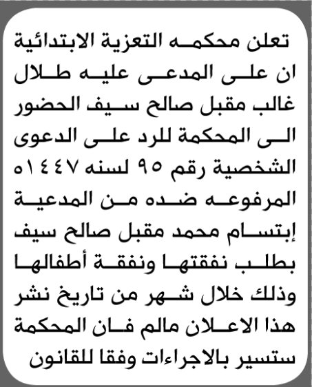 تعلن محكمة التعزية أن على المدعى عليه طلال سيف الحضور إلى المحكمة إعلاناتمحاكم On أبريل 12, 2026 Share Share FacebookTwitterWhatsAppTelegramGoogle+البريد الإلكترونيPrint