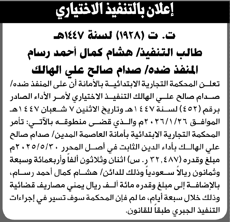 تعلن المحكمة التجارية الابتدائية بأن على المنفذ ضده/ صدام صالح الهالك التنفيذ الاختياري إعلاناتمحاكم On أبريل 14, 2026 Share Share FacebookTwitterWhatsAppTelegramGoogle+البريد الإلكترونيPrint