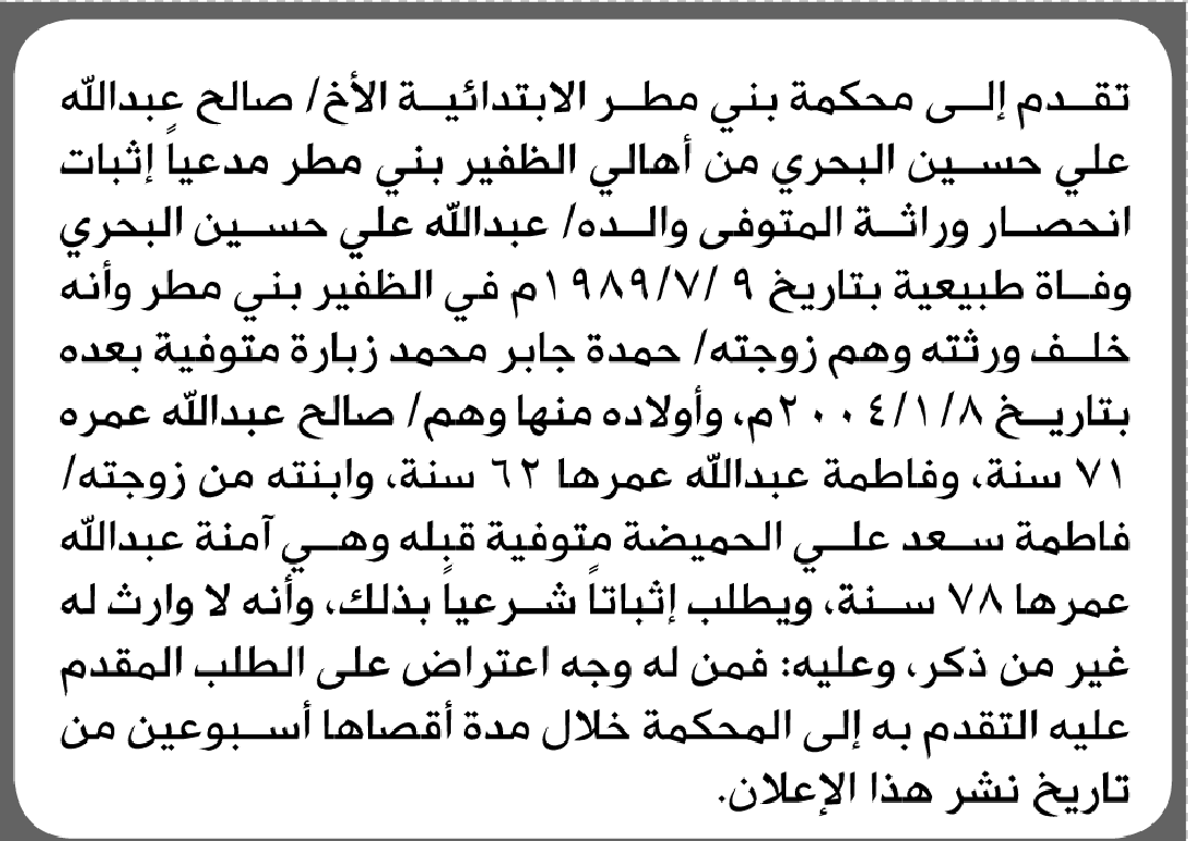 تعلن محكمة بني مطر أن الأخ صالح البحري تقدم بدعوى انحصار وراثة إعلاناتمحاكم On أبريل 13, 2026 Share Share FacebookTwitterWhatsAppTelegramGoogle+البريد الإلكترونيPrint