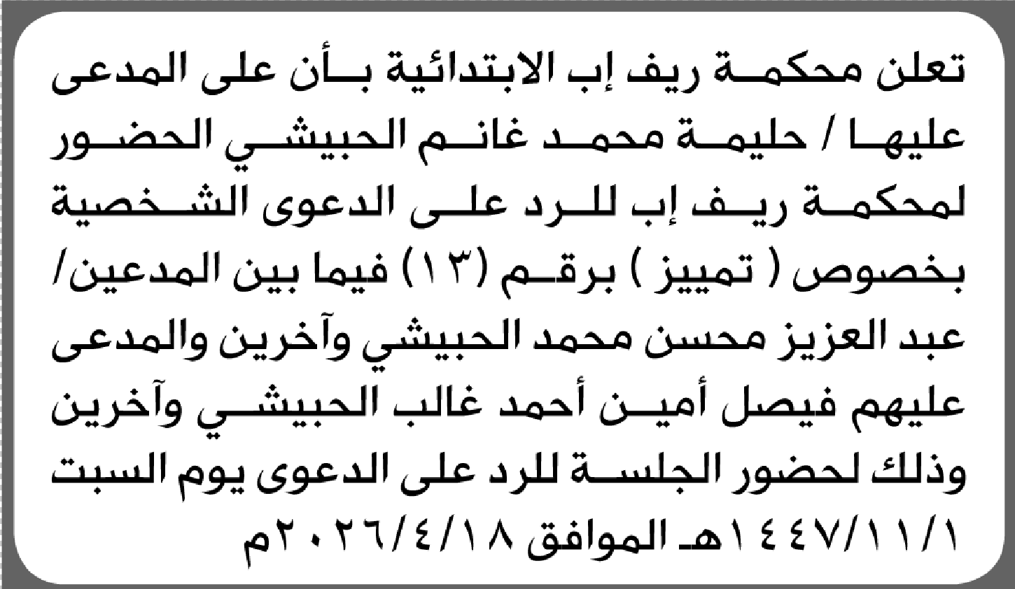 تعلن محكمة ريف إب أن على المدعى عليها حليمة الحبيشي الحضور إلى المحكمة إعلاناتمحاكم On أبريل 13, 2026 Share Share FacebookTwitterWhatsAppTelegramGoogle+البريد الإلكترونيPrint