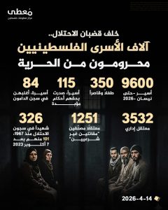 وأوضح المركز في تقرير إحصائي، أن عدد الأسرى بلغ نحو 9600 أسير حتى أبريل 2026، من بينهم 350 طفلًا وقاصرًا، فيما أشار إلى وجود 115 أسيرًا صدرت بحقهم أحكام بالسجن المؤبد.