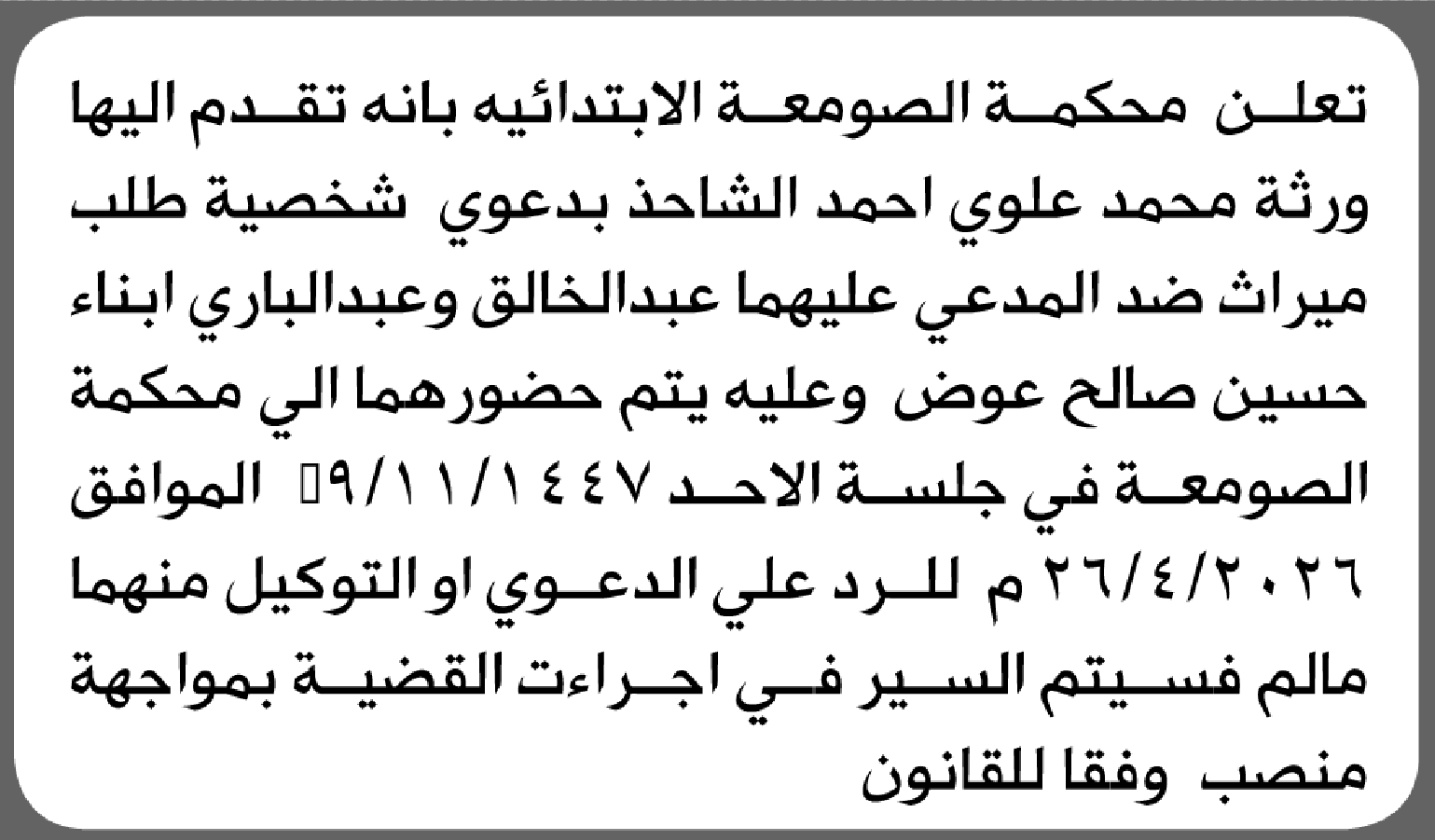 تعلن محكمة الصومعة بأن على/ عبدالخالق وعبدالباري صالح عوض الحضور إلى المحكمة إعلاناتمحاكم On أبريل 15, 2026 Share Share FacebookTwitterWhatsAppTelegramGoogle+البريد الإلكترونيPrint