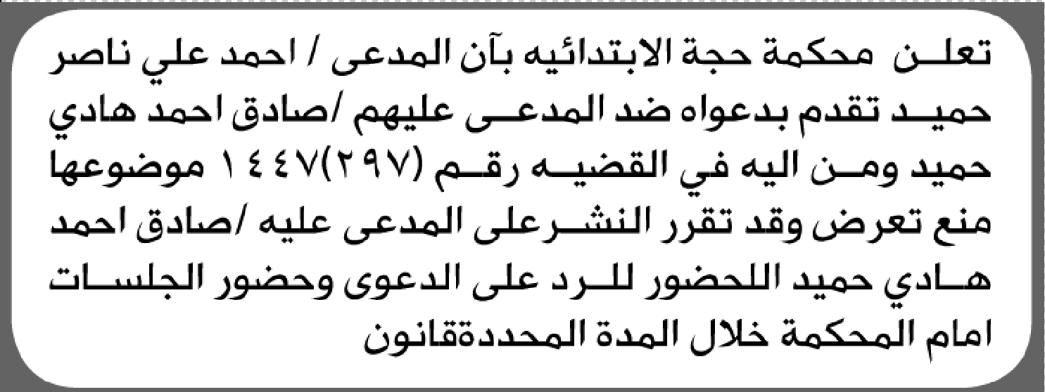 تعلن محكمة حجة الابتدائية بأن على/ صادق أحمد حميد الحضور إلى المحكمة إعلاناتمحاكم On أبريل 15, 2026 Share Share FacebookTwitterWhatsAppTelegramGoogle+البريد الإلكترونيPrint