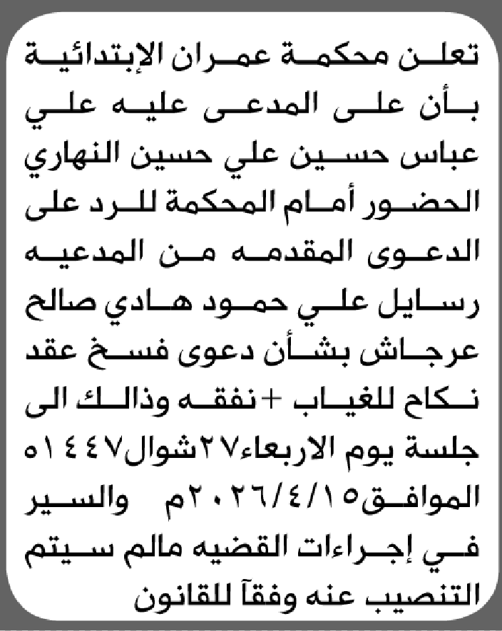 تعلن محكمة عمران الابتدائية بأن على/ علي عباس النهاري الحضور إلى المحكمة إعلاناتمحاكم On أبريل 16, 2026 Share Share FacebookTwitterWhatsAppTelegramGoogle+البريد الإلكترونيPrint