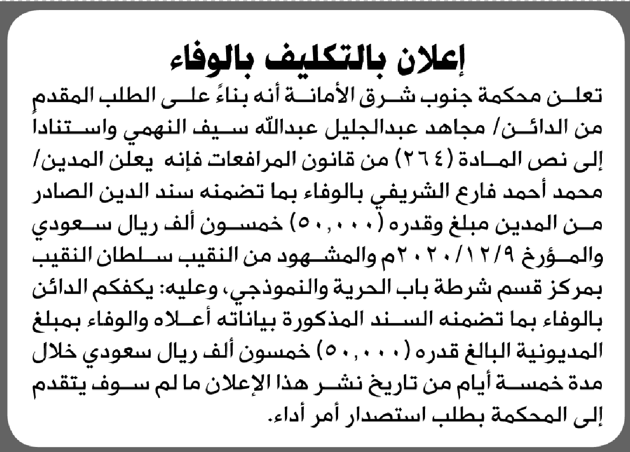 تعلن محكمة جنوب شرق الأمانة تكليف بالوفاء على المدين/ محمد أحمد الشريفي إعلاناتمحاكم On أبريل 16, 2026 Share Share FacebookTwitterWhatsAppTelegramGoogle+البريد الإلكترونيPrint