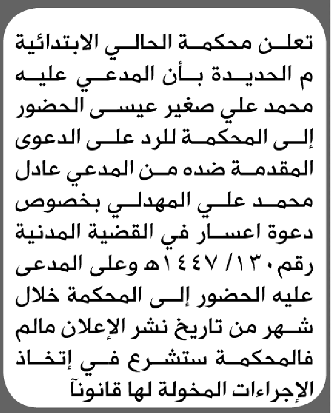 تعلن محكمة الحالي أن على المدعى عليه محمد علي صغير الحضور إلى المحكمة إعلاناتمحاكم On أبريل 15, 2026 Share Share FacebookTwitterWhatsAppTelegramGoogle+البريد الإلكترونيPrint
