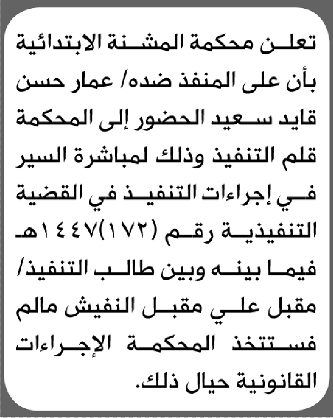 تعلن محكمة المشنة أن على المنفذ ضده عمار حسن قايد الحضور إلى المحكمة إعلاناتمحاكم On أبريل 15, 2026 Share Share FacebookTwitterWhatsAppTelegramGoogle+البريد الإلكترونيPrint