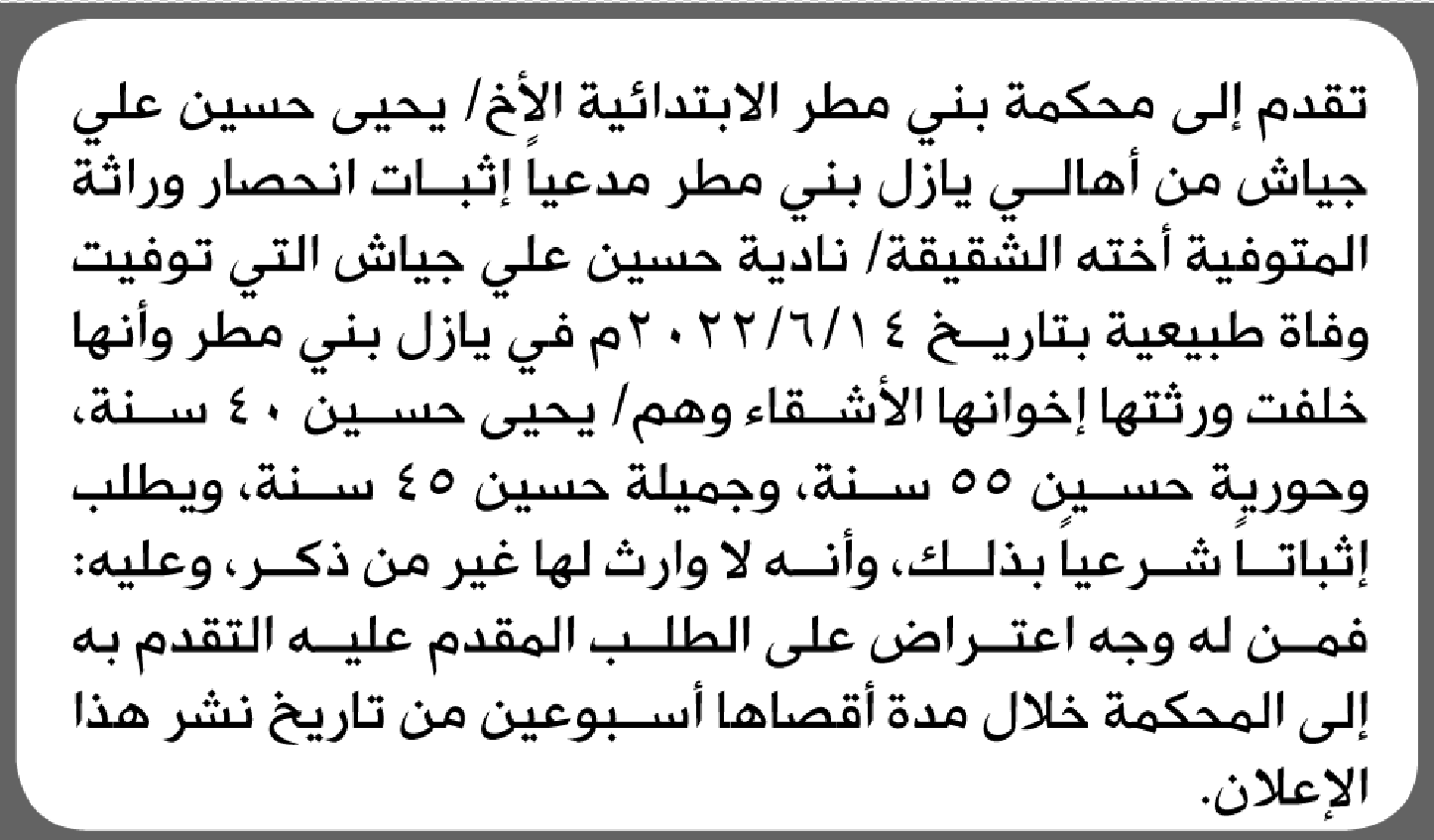 تعلن محكمة بني مطر أن الأخ يحيى جياش تقدم بدعوى انحصار وراثة إعلاناتمحاكم On أبريل 15, 2026 Share Share FacebookTwitterWhatsAppTelegramGoogle+البريد الإلكترونيPrint