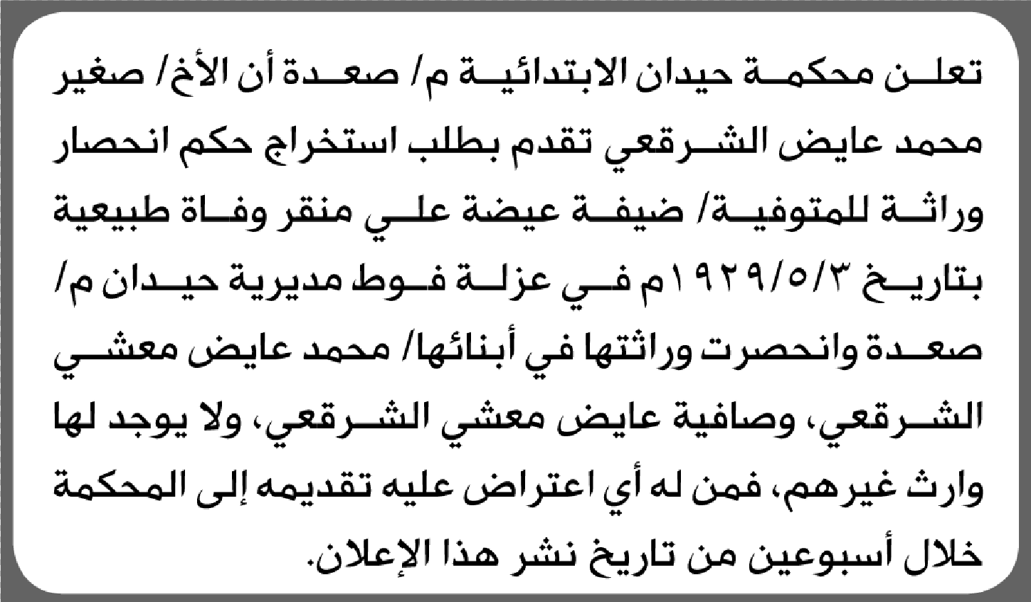 تعلن محكمة حيدان أن الأخ صغير الشرقعي تقدم بدعوى انحصار وراثة إعلاناتمحاكم On أبريل 15, 2026 Share Share FacebookTwitterWhatsAppTelegramGoogle+البريد الإلكترونيPrint